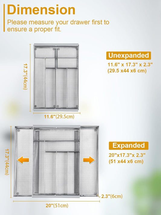 Silverware Organizer Metal Mesh, Large Drawer Organizer, Utensil Cutlery Tray for kitchen drawers, Expandable Flatware Organizer with 8 Compartment Silver 11.6"~20" x 17.3"