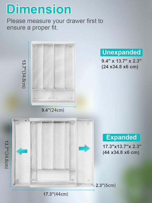 Silverware Organizer Metal Mesh, Drawer Organizer, Utensil Cutlery Tray for kitchen drawers,Expandable Flatware Organizer with 7 Compartment White 9.4"~17.3" x 13.7"