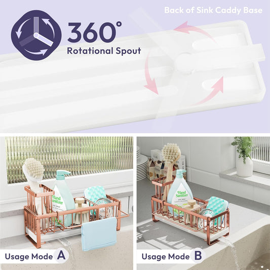 SWTYMIKI Sponge Holder for Kitchen Sink - Sink Caddy with Brush Holder Self-draining Sponge Caddy Organizer with Divider Stainless Steel Kitchen Accessories Storage for Countertop, Rose Gold