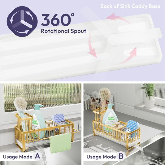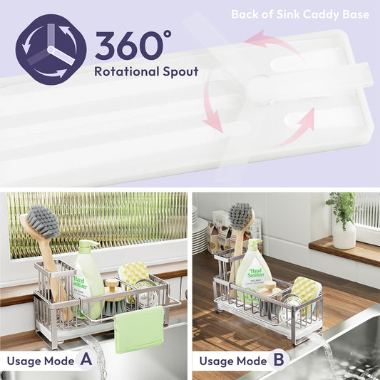 SWTYMIKI Sink Caddy Sponge Holder - Large Sponge Holder for Kitchen Sink with 360°Auto-Drain Tray, Rustproof Stainless Steel Kitchen Organizer Caddy for Countertop Organization