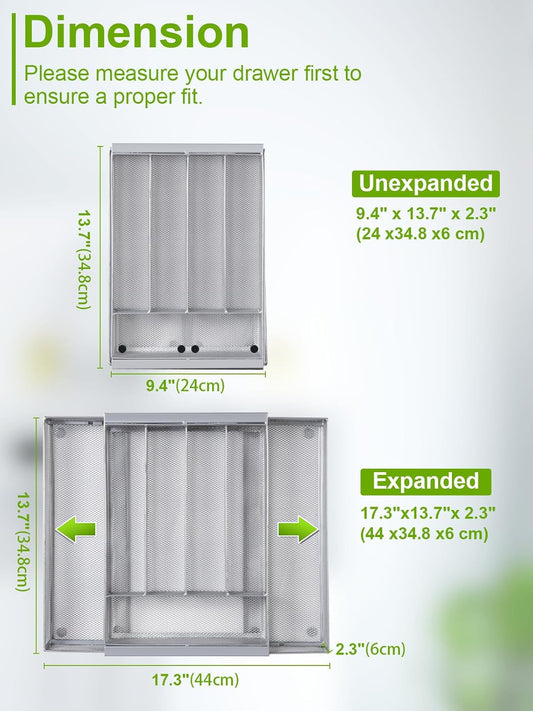Silverware Organizer Metal Mesh, Drawer Organizer, Utensil Cutlery Tray Expandable Flatware Organizer with 7 Compartment Silver 9.4"~17.3" x 13.7"