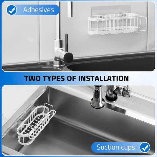 Cisily Kitchen Sink Caddy Sponge Holder in The Sink, Stainless Steel Kitchen Sink Organizer, Brush Holder, Dish Cloth Hanger, Sink Stopper Holder with Suction & Adhesives Installation Ways (White