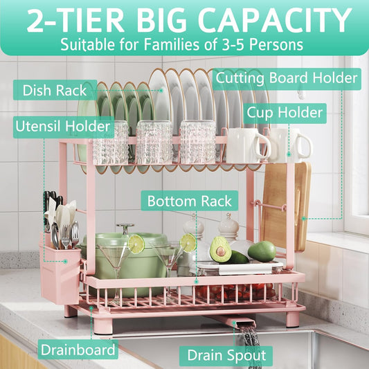 Multifunctional Dish Drying Rack - Rustproof, 2-Tier Dish Racks with Drainboard, Space-Saving Design, Utensil & Cup Holder for Kitchen Counter, Pink