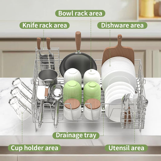 Multifunctional Dish Drying Rack - Rustproof, 2-Tier Dish Racks with Drainboard, Space-Saving Design, Utensil & Cup Holder for Kitchen Counter, White