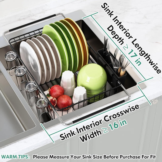 Extendable Dish Racks 16.3"-21.6" L x 16.7" W,Stainless Steel Dish Drying Rack for Kitchien Counter, Anti-Rust Dish Strainer with Cutlery Holder