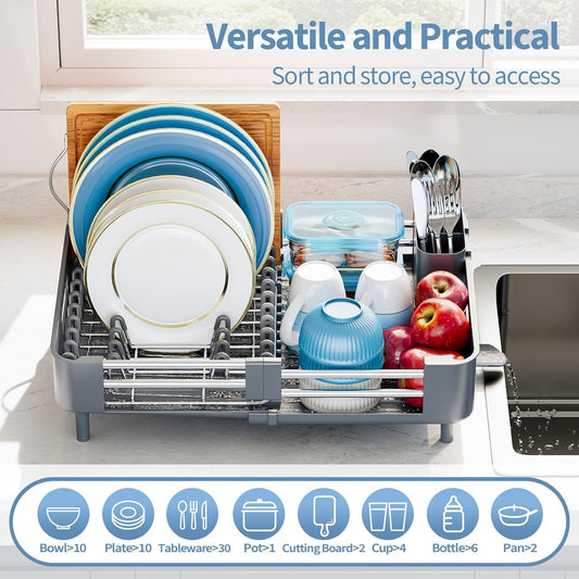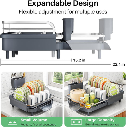 Dish Drying Rack, Expandable Dish Rack for Kitchen Counter, Stainless Steel Dish Drainer with Drainboard Set and Utensil Holder (Gray)