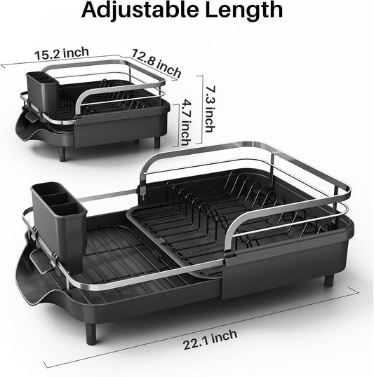 Dish Drying Rack for Kitchen Counter, Extendable Dish Rack with Drainboard, Collapsible Dish Drainer, Expandable Dish Strainer with Cutlery Holder, Foldable Home Countertop Plate Storage Rack, Black