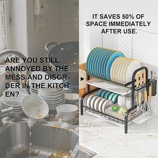 LEGUANG 2-Tier Stainless Steel Dish Drying Rack, Space-Saving Kitchen Organizer for in/Over Sink/Counter, with Removable Drain Tray & Cutlery Holder & Utensil Holder, Black