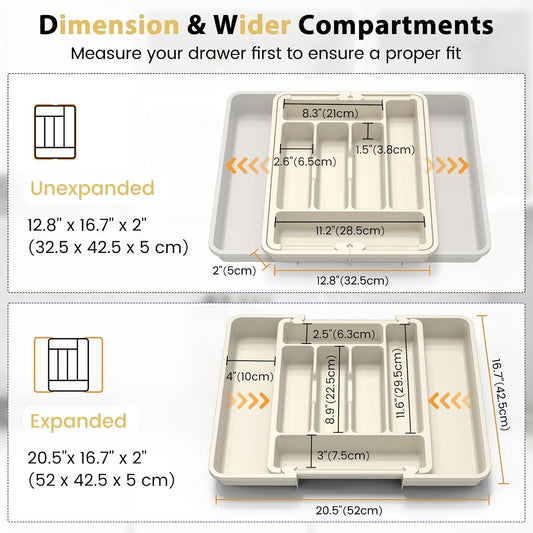 Caperci Large Silverware Organizer for Kitchen Drawer & Utensils - Expandable Drawer Organizer for Cutlery, Flatware & Gadget, BPA-Free Thick Plastic, Wider Compartments & Non-skid Feet (Tofu)