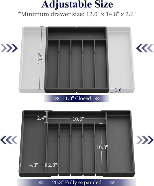 Kitsure Silverware Organizer for Drawers - Expandable Cutlery and Utensil Drawer Organizer with Easy Maintenance, Premium PP Kitchen Organizers and Storage for Flatware, Black, 20.3" x 13.8" x 1.6"