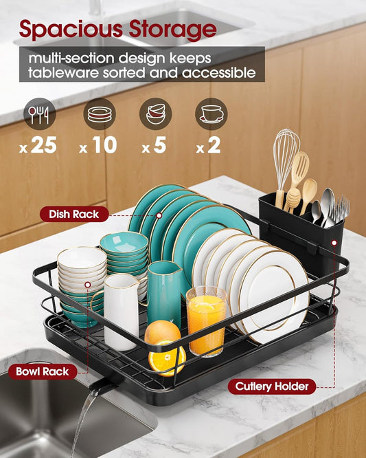 Stainless Steel Dish Drying Rack for Kitchen Counter, Sink Organization and Storage Essentials with Silverware & Utensil Holder, Home and Apartment Decor, 12''W x 15.6''L, Black