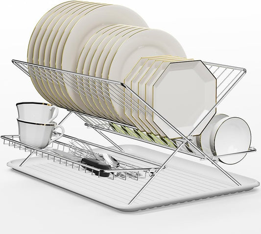 Dish Rack with Drip Tray, Stainless Steel 3-Tier Collapsible Drainer Dish Drying Rack for Kitchen Counter, Sink, Countertop,Cutlery, Dishes Utensils Flatware Holder Set, Reversible Cup Draining Rack