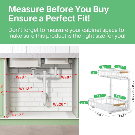 Premium Heavy Duty Carbon Steel Under Sink Organizer, 2 Tier Pull Out Cabinet Organizer, 7 Adjustable Heights with Smooth Ball Bearing Sliding Baskets for Bathroom & Kitchen