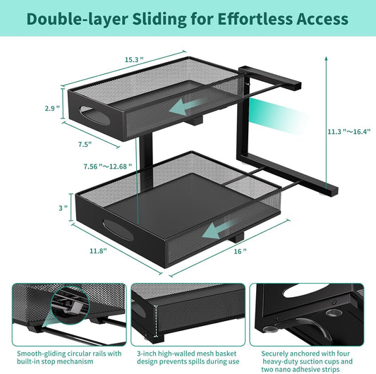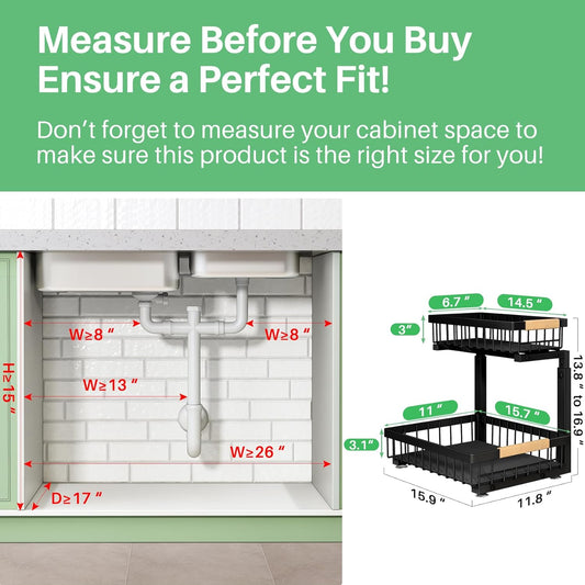 Under Sink Organizer, Extra-Wide Upgrade, 1-Pack of 2-Tier Metal Slide Out Cabinet Organizer, Height Adjustable Organization and Storage Series, Bathroom/Cabinet/Kitchen organization, Black