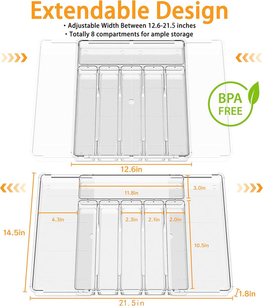 Silverware Drawer Organizer, Expandable Utensil Tray for Kitchen Drawers,BPA Free Flatware and Cutlery Holder,Adjustable Plastic Storage for Utensil like Spoons, Forks, Knives.Clear