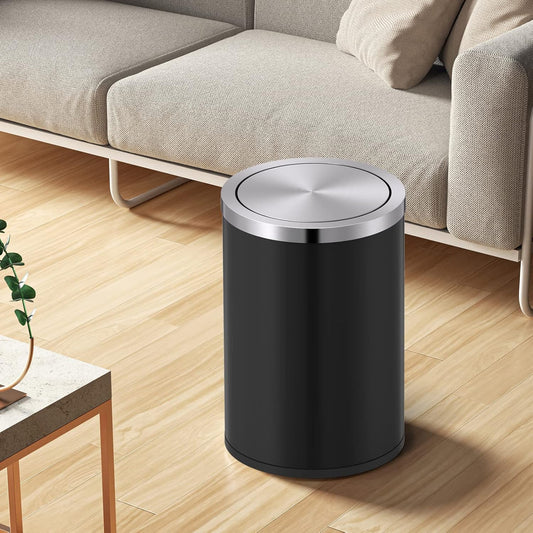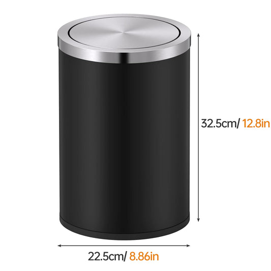 Mbillion Small Trash Can with Swing Lid 2.4 Gallons/9 Liter, Mini Trash Can with lid, Stainless Steel Cylindrical Garbage Can for Home and Office Bathroom Bedroom, for Ground and Desktop(Black)