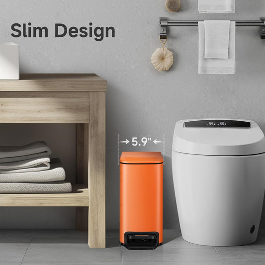 TIPGO Small Bathroom Trash Can with Lid Soft Close, 6 Liter / 1.6 Gallon Stainless Steel Garbage Can with Removable Inner Bucket, Step Pedal, Slim Trash Cans for Bedroom, Office, Kitchen (Orange)
