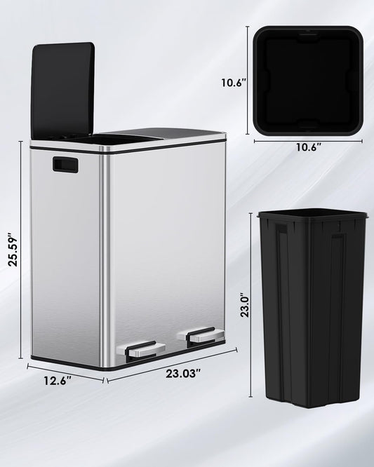 Arlopu 16 GallonStainless Steel Trash Can, 60L Dual Compartment, Metal Kitchen Step Recycle Bin, Metal Double Dustbin, in-Home Garbage Rubbish Can W/Removable Liner Buckets (Silver)