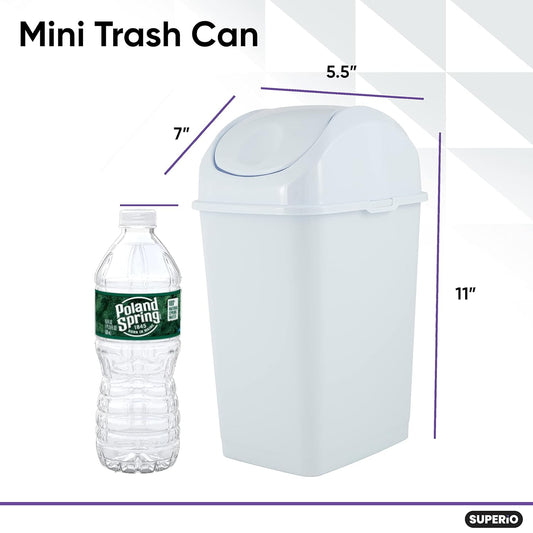 Superio Mini Desktop Trash Can with Swing Top Lid Portable Plastic Garbage Can for Countertop, Desktop, Make up Vanity, Bathroom, Car, Under Sink, Dorm, Compact Waste Bin 5 L, 1.25 Gal. (White)