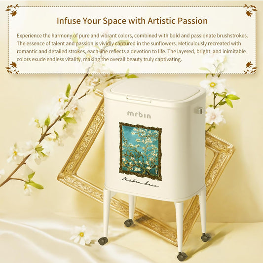 MRBIN Metal Kitchen Trash Can with Wheel Legs, 36L / 9.5gal Medium Press Lid Slim Removable Waste Basket, Pet Proof Tall Narrow Garbage Pail for Vanity, Bedroom, Bathroom, Living Room, Water Lily
