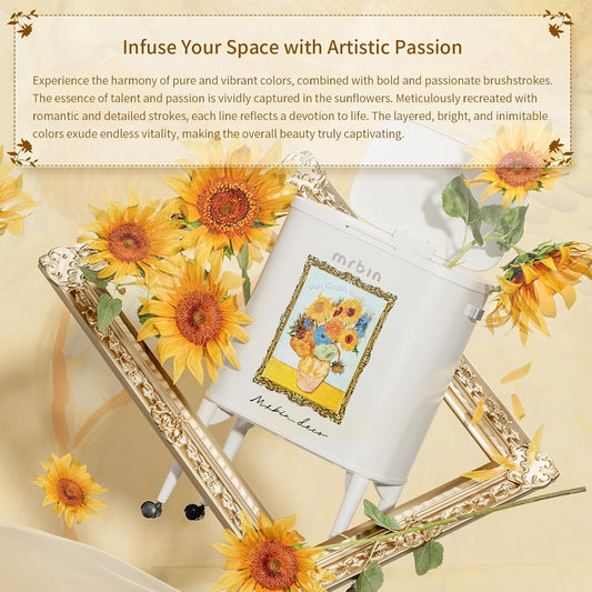 MRBIN Metal Kitchen Trash Can with Wheel Legs, 36L / 9.5gal Medium Press Lid Slim Waste Basket, Pet Proof Tall Narrow Garbage Pail for Vanity, Bedroom, Bathroom, Living Room, Sunflower