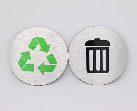 Metal Trash & Recycling Signs | Garbage & Recycling Bin Marker | Set of 2 - 1 Black Trash Sign & 1 Green Recycle Sign | 3" Round, Brushed Silver Aluminum Signs | Made in USA