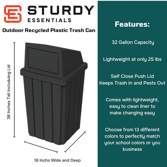 32 Gallon Square Slatted 100% Recycled Plastic Heavy-Duty Commercial Outdoor or Indoor Trash Can with Push Top Lid | Great for Schools and Businesses - Black