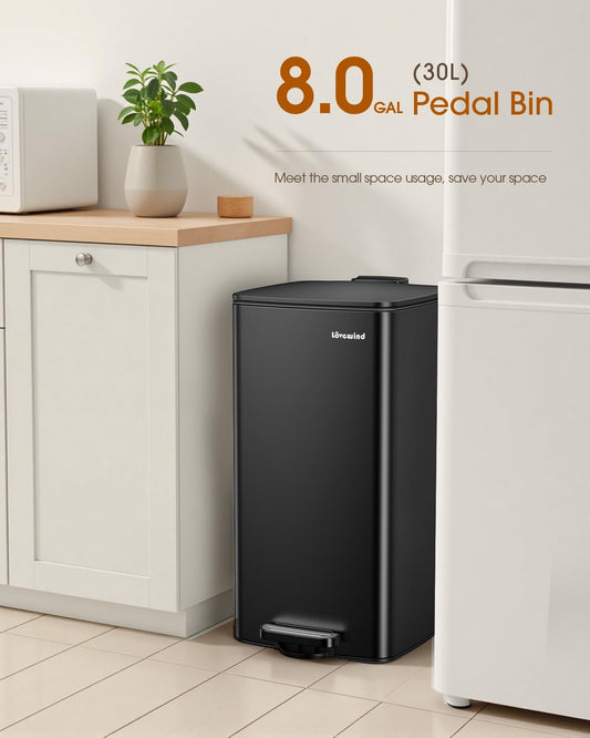 Lovewind Kitchen Trash Can with Lid, 8 Gallon/30 L Footstep Garbage Can for Kitchen Bedroom Home Office, 30 Liter Trash Bin Brushed Stainless Steel Waste Bin with Soft-Close Lid,Black
