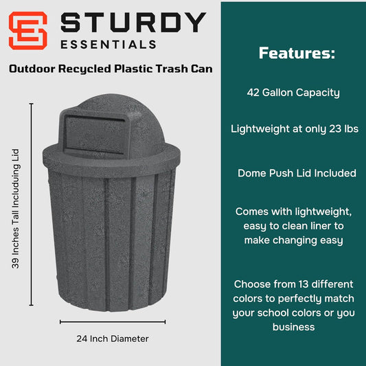 42 Gallon Slated Circle 100% Recycled Plastic Heavy Duty Outdoor Trash Can with Push Open Dome Lid and Internal Liner - Great for Schools and Businesses - Dark Granite