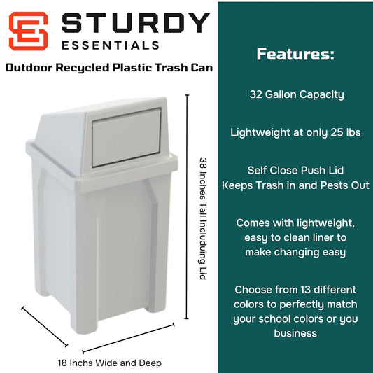 32 Gallon Square 100% Recycled Plastic Heavy Duty Outdoor Trash Can with Push Lid - Great for Schools and Businesses - White