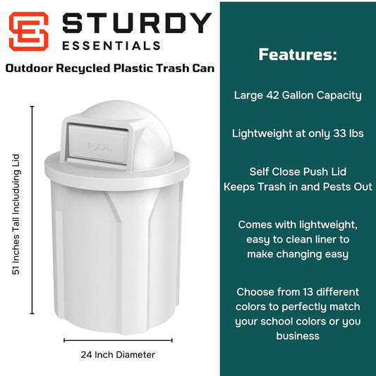 42 Gallon Slated Circle 100% Recycled Plastic Heavy Duty Outdoor Trash Can with Push Open Dome Lid and Internal Liner - Great for Schools and Businesses - White