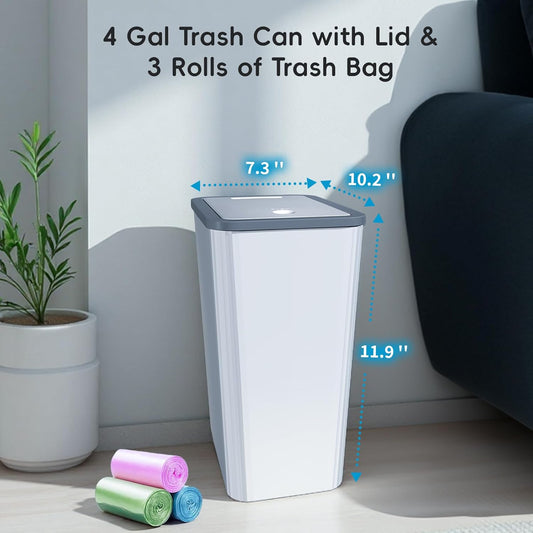 Small Trash Can, 3 Pack 4 Gallons Bathroom Garbage Can with Lid Press-Top, Small Waste Basket with Trash Bags, Slim Plastic Garbage Bin for Dorm, Office, Bedroom, Kitchen, Living Room (Multi)