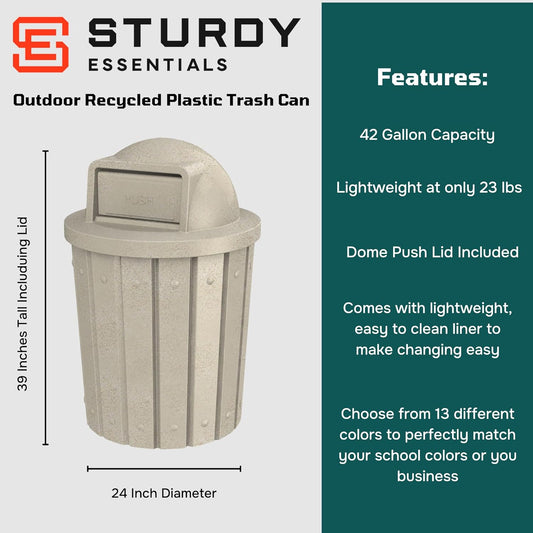 42 Gallon Slated Circle 100% Recycled Plastic Commercial Outdoor or Indoor Trash Can with Push Open Dome Lid and Internal Liner | Great for Schools and Businesses - Beige Granite