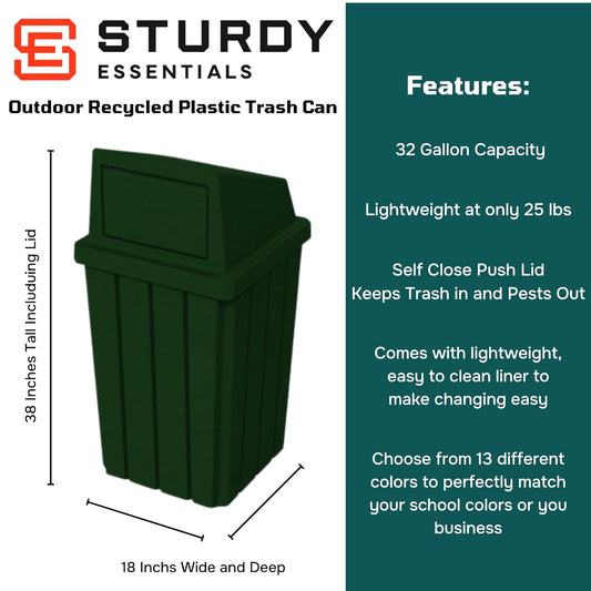 32 Gallon Square 100% Recycled Plastic Heavy Duty Outdoor Trash Can with Push Lid - Great for Schools and Businesses - Red