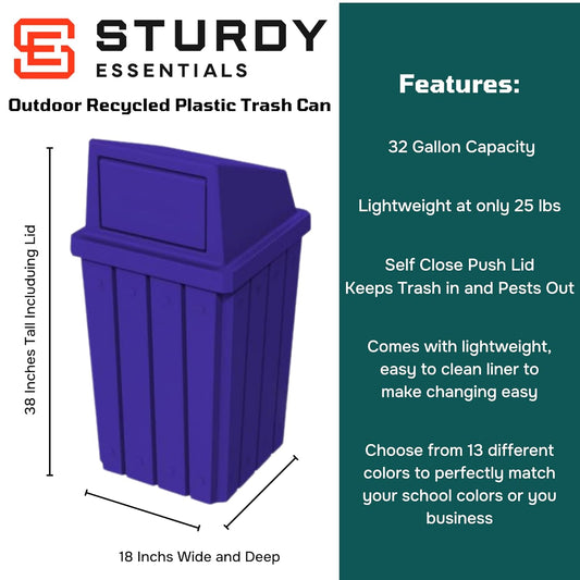 32 Gallon Square Slatted 100% Recycled Plastic Heavy-Duty Commercial Outdoor or Indoor Trash Can with Push Top Lid | Great for Schools and Businesses - Blue