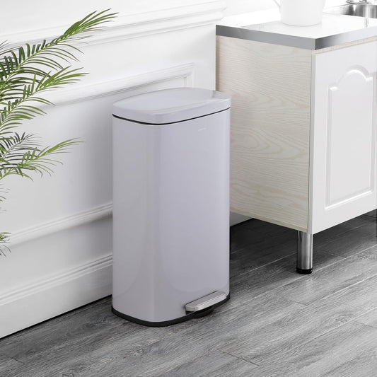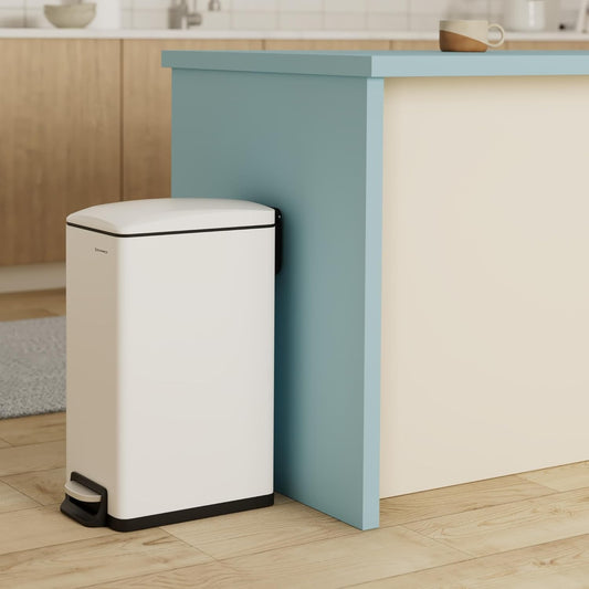 happimess HPM1011C Curtis 8-Gallon Step-Open Trash Can with Soft-Close Lid, Modern, Minimalistic, Fingerprint Proof for Home, Kitchen, Laundry Room, Office, Bedroom, Bathroom, White