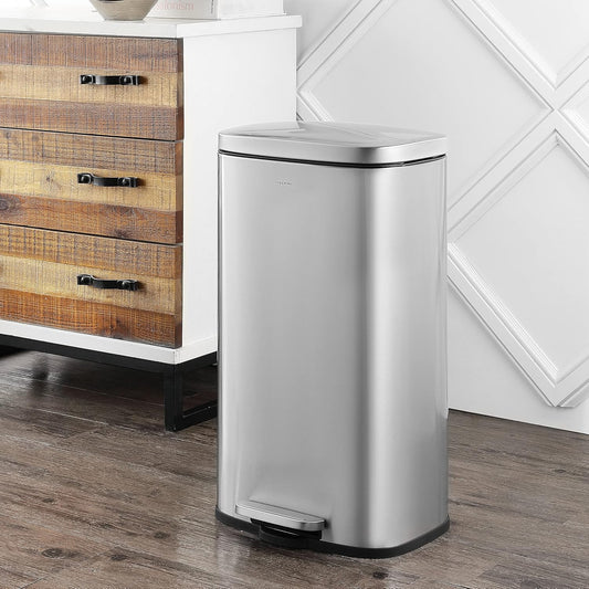 happimess HPM1011A Curtis 8-Gallon Step-Open Trash Can with Soft-Close Lid, Modern, Minimalistic, Fingerprint Proof for Home, Kitchen, Laundry Room, Office, Bedroom, Bathroom, Chrome