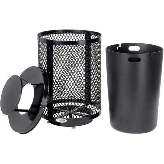 Global Industrial Heavy-Duty 36 Gallon Capacity Outdoor Metal Slatted Trash Receptacle with Rain Bonnet Lid & Plastic Liner, Black, Commercial & Industrial Trash Can