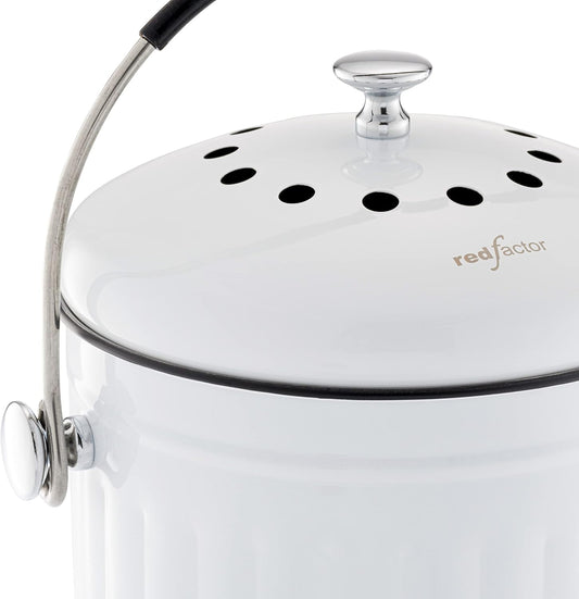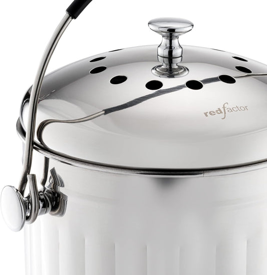 RED FACTOR Premium Compost Bin for Kitchen Countertop - Stainless Steel Food Waste Bucket with Innovative Dual Filter Technology - Includes Spare Filters (White, 1.3 Gallon)