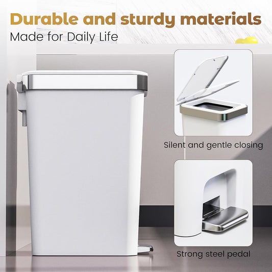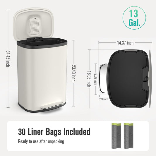 13 Gallon Stainless Steel Foot Pedal Large Trash Can with Soft Close Quiet Curved Surface Top Lid and Deodorant Storage Space, with 30 Garbage Bags for Kitchen/Home/Office Trash can and More - White