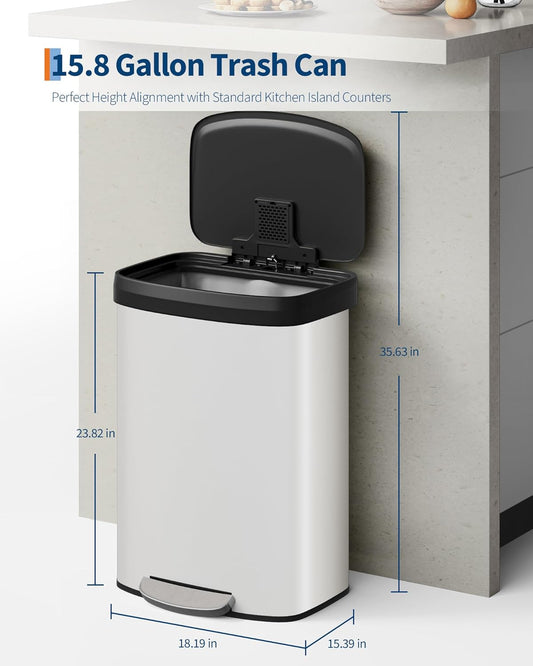 16 Gallon (60 l) Trash Can, Stainless Steel Kitchen Garbage Can, Recycling or Waste Bin with Liner Rim, Rear Handle, Soft Close Plastic Lid Step-on Pedal, Removable Inner Bucket