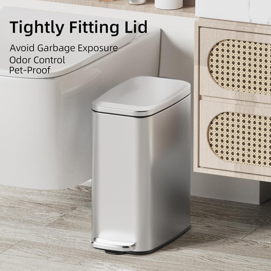 KUK Slim Bathroom Trash Can with Lid, 1.6 Gal / 6L Stainless Steel Small Garbage Bin with Detachable Inner Bucket, Step Pedal, Silent Close, Wastebasket for Toilet, Bedroom, Home, Office (Silver)