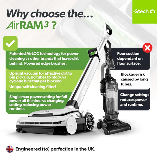 Gtech AirRAM 3 Cordless Vacuum Cleaner with Anti-Hair Wrap Bar - Dual Edge-Clean Brushes - Perfect for Carpet and Hardwood Floors - Rechargeable 22v Li-ion Battery - Lightweight - New Model/Red Thread