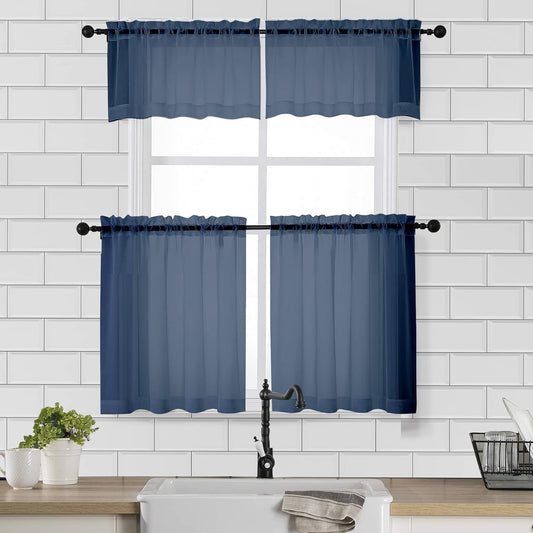 Chyhomenyc Sheer Curtains Tiers 42W x 24L Inches 2 Pieces, Light Filtering Small Curtains, Short Bathroom Living Room Cafe Basement Voile Window Curtain, Rod Pocket, Navy Blue