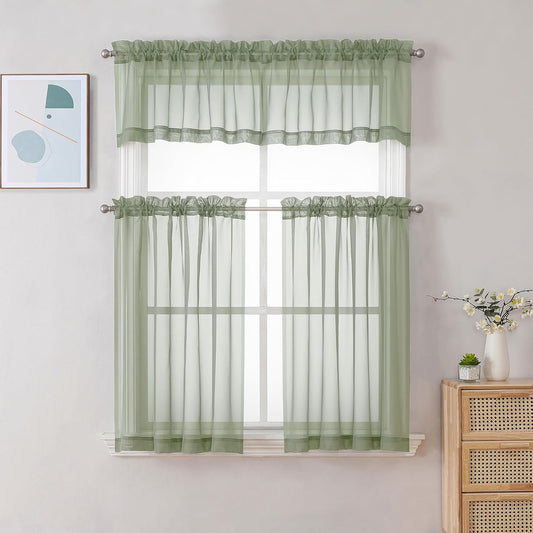 Chyhomenyc Sheer Window Valance Curtains, 42x14 Inches 2PCS, Light Filtering Valances Windows Treatment, Small Rod Pockets Voile Sheer Curtains for Living Room/Bathroom/Basement, Sage Green