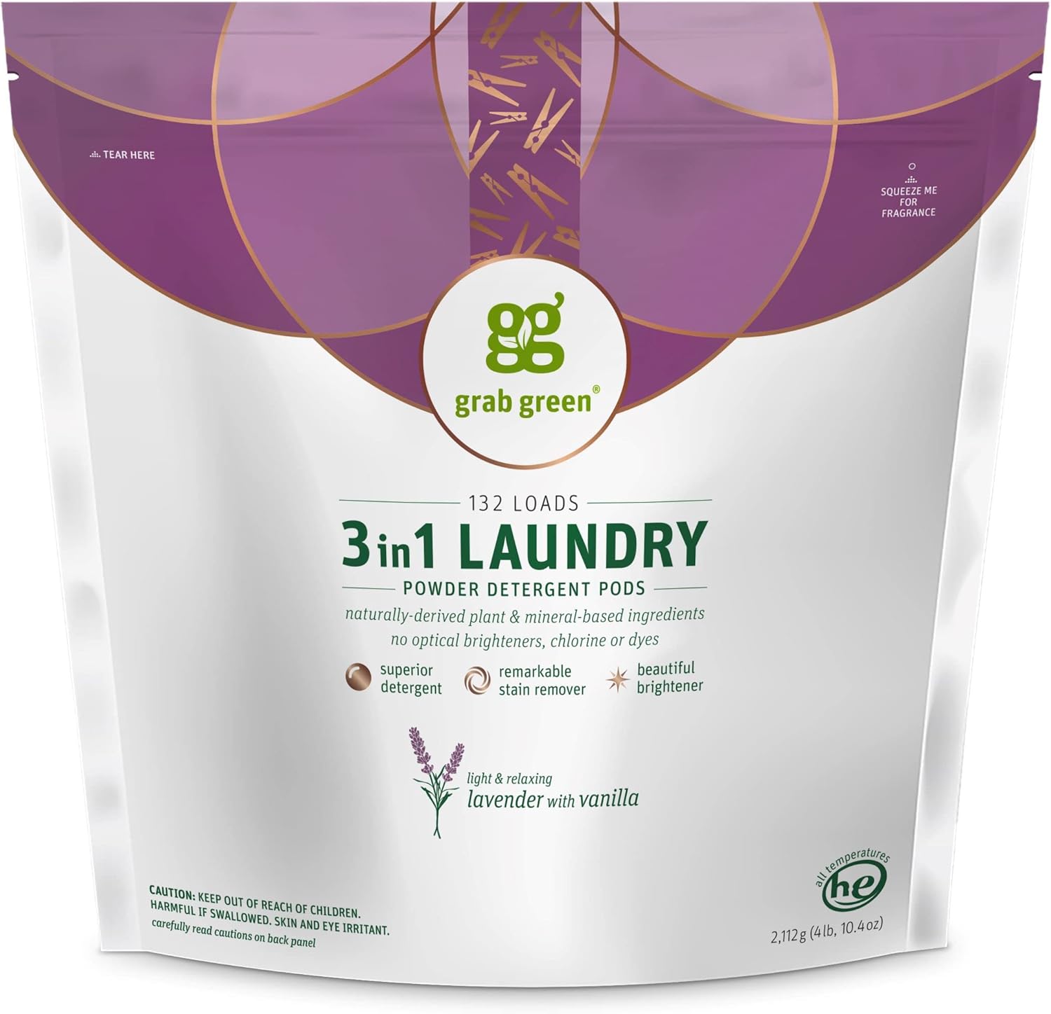 - Contains: 1- 132 Pod Bag of Grab Green Natural Lavender with Vanilla 3in1 Laundry Detergent Pods. Our velcro closure bags are convenient and easy to use, no hassling with frustrating zip closures