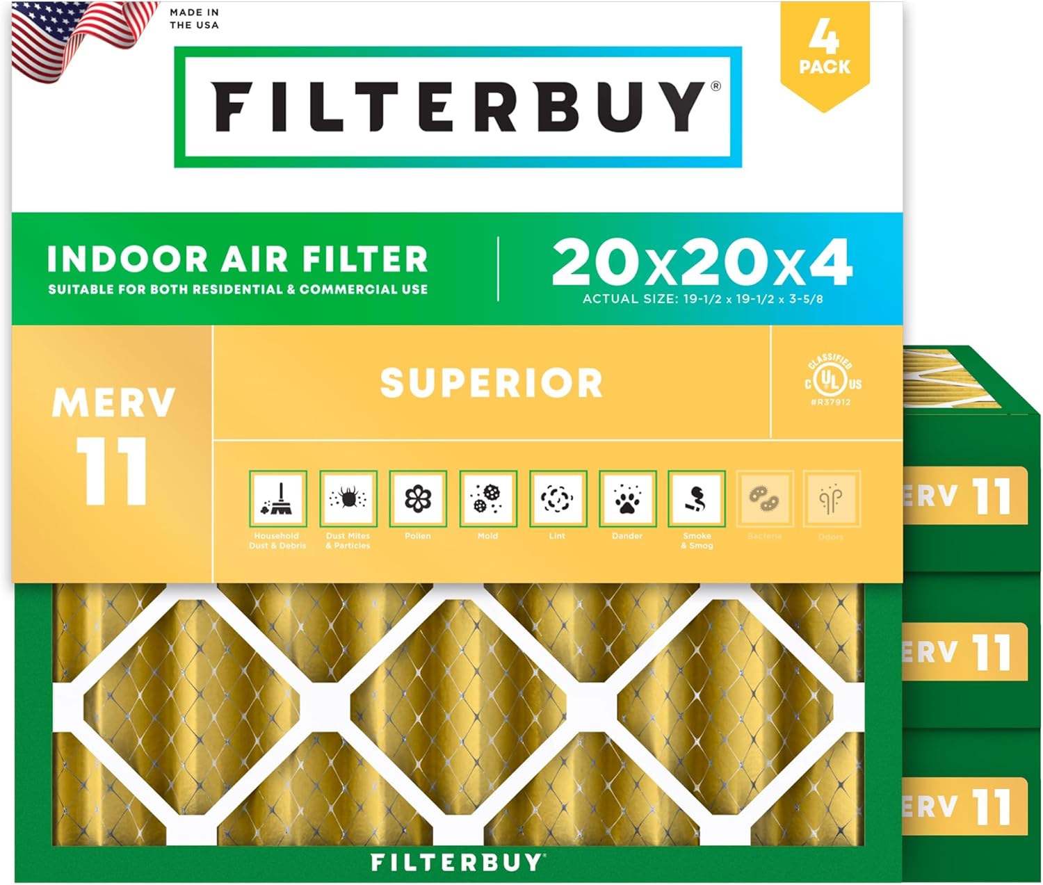 Filterbuy 20x20x4 Air Filter MERV 11 (MPR 1200) Allergen Defense Replacement (4-Pack), Electrostatic Pleated HVAC AC Furnace Filters, Made in USA (Actual Size: 19.50 x 19.50 x 3.63)