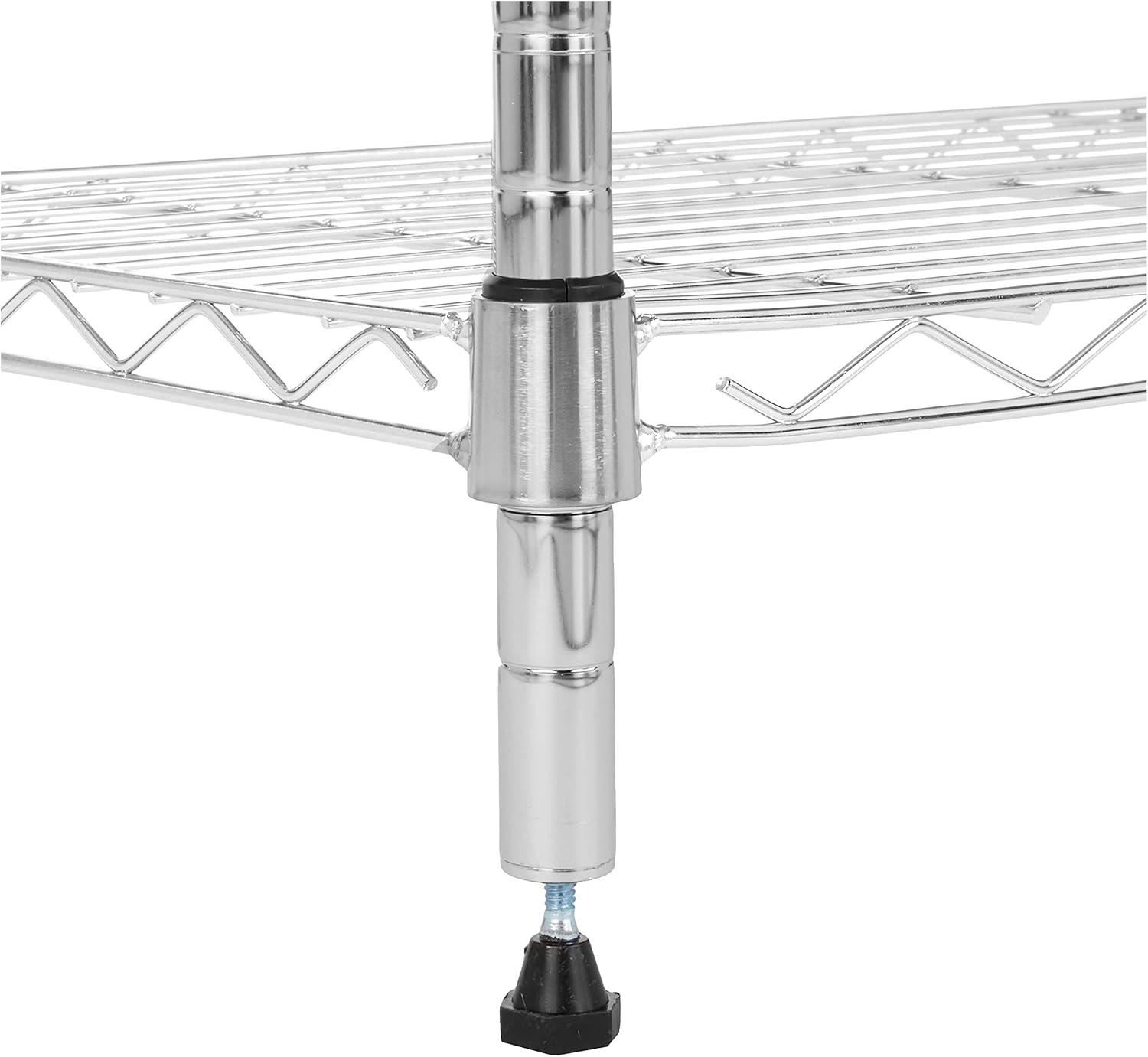 - Durable steel construction with a Chrome finish; each shelf holds up to 350 pounds, evenly distributed; 1400 pound total weight capacity