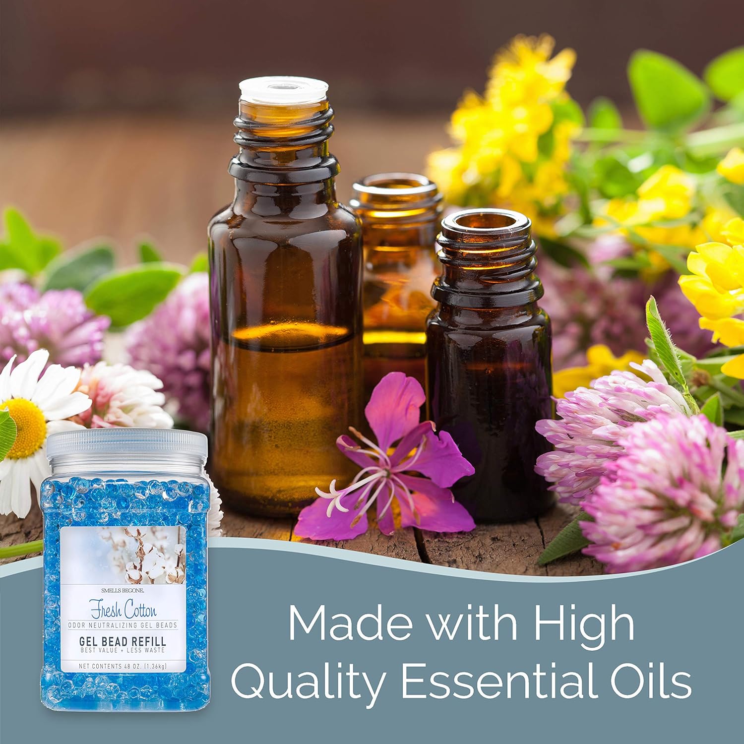 - MADE WITH ESSENTIAL OILS - Each Odor Eliminator Gel Bead jar contains 12 ounces of product and the larger refill jar contains 48 ounces of product. The products are made with plant derived ingredients and formulated with a blend of essential oil based fragrances which adds a distinct and unforgettable aroma to any area you place and use the jar.