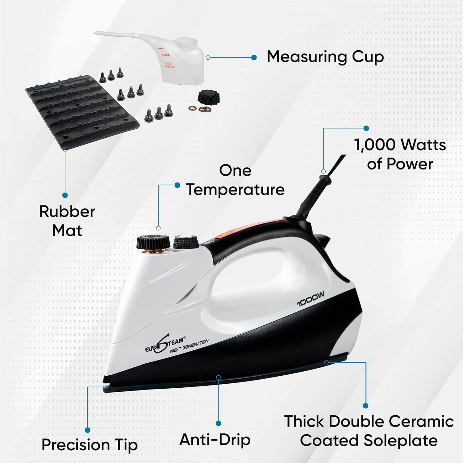 - PROFESSIONAL POWER & WARRANTY: With a powerful 120V/1000 watts, this iron has the quality of a professional-grade tool, making it perfect for sewers, quilters, and crafters. It includes a rubber mat and a measuring cup, and is backed by a one-year warranty. The non-stick soleplate is durable enough to glide over beads and sequins without causing damage.